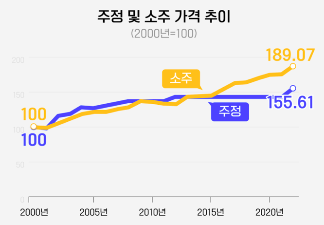 특히 전통 증류 소주에서는 쌀이나 보리를 이용한 원재료 발효가 일반적이었으나, 지금의 희석식 소주는 가격 경쟁력을 위해 저렴한 수입 전분이 대세가 된 상황입니다.